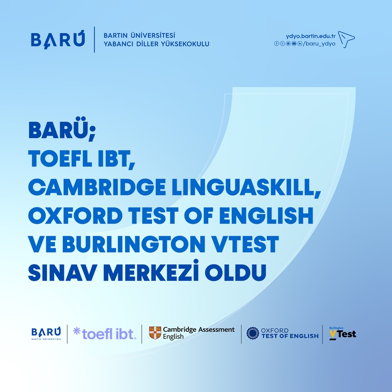 Bartın Üniversitesi (BARÜ) uluslararası geçerliliği bulunan TOEFL IBT, Cambridge Linguaskill General, Oxford Test of English ve Burlington VTest için yetkili sınav merkezi oldu.