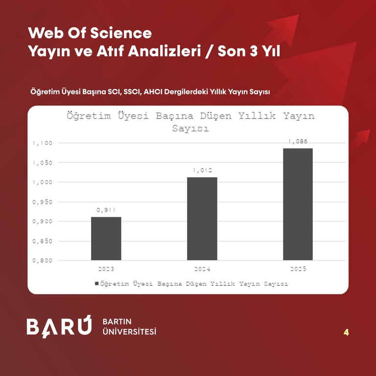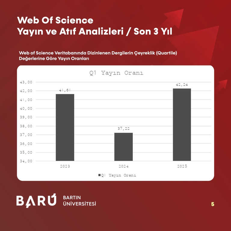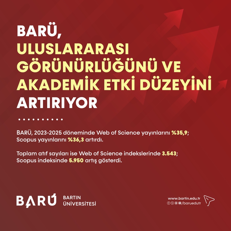 BARÜ, Web of Science verilerine göre 2023-2025 döneminde toplam yayın sayısında 153 artış gösterdi. Buna göre artış oranı yaklaşık %35,9 oldu. Çekirdek indekslerde (SCI, SSCI, A&HCI) yayın sayısı 2023’te 333, 2024’te 414 ve 2025’te 479 olarak açıklandı. 2025 yılı itibarıyla çekirdek indekslerdeki yayın sayısı, 2023 yılına kıyasla 146 artarak yaklaşık %43,8’lik ilerleme kaydedildi. Öğretim üyesi başına düşen yıllık yayın sayısı 2023’te 0,911, 2024’te 1,012 ve 2025’te 1,086 olarak hesaplandı. Böylece 2023’e göre öğretim üyesi başına düşen yayın sayısında 0,175’lik bir artış görüldü. Dergi kalitesini yansıtan çeyreklik dağılımlarında ise Q1 dergilerde yayımlanan yayınların oranı 2023’te %41,61, 2024’te %37,22 ve 2025’te %42,24 olarak belirlendi.