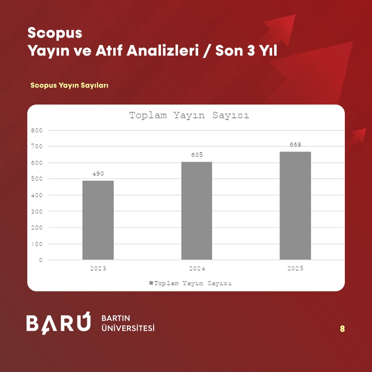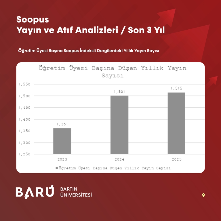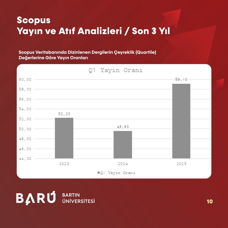 Scopus veri tabanına dayalı göstergelerde BARÜ, benzer bir yükseliş ortaya koydu. Scopus’ta dizinlenen dergilerde yayımlanan toplam yayın sayısı 2023 yılında 490 iken, 2024'te 605'e, 2025 yılında ise 668'e yükseldi. Toplam yayın sayısındaki artış oranı son 3 yılda %36,3 oldu. Öğretim üyesi başına düşen Scopus indeksli yıllık yayın sayısı 2023’te 1,361 iken 2024’te 1,501’e, 2025’te ise 1,515’e yükseldi. Q1 dergilerde yayımlanan yayınların oranı ise 2023’te %52,20, 2024’te %49,60 ve 2025’te %59,10 olarak hesaplandı.