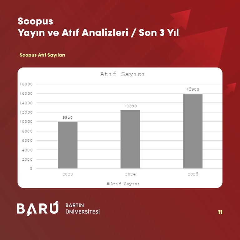 Scopus kapsamındaki atıf sayılarında önemli bir artış sergilendi. Toplam atıf sayısı 2023’te 9.950 iken 2024’te 12.390’a, 2025’te 15.900’e ulaştı. Scopus atıflarında 3 yıllık dönemde 5.950’lik bir artış kaydedildi. Böylece BARÜ, uluslararası indekslerdeki görünürlüğünü ve bilimsel etki düzeyini her geçen yıl arttığını ortaya koyarken araştırma ve yayın performansındaki sürdürülebilir gelişimini de bir kez daha kanıtladı.