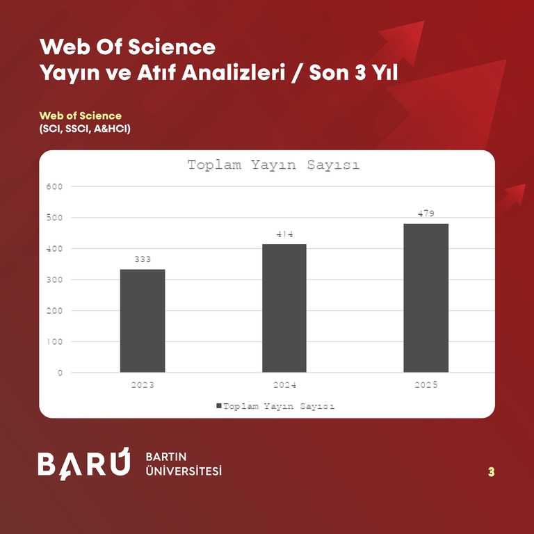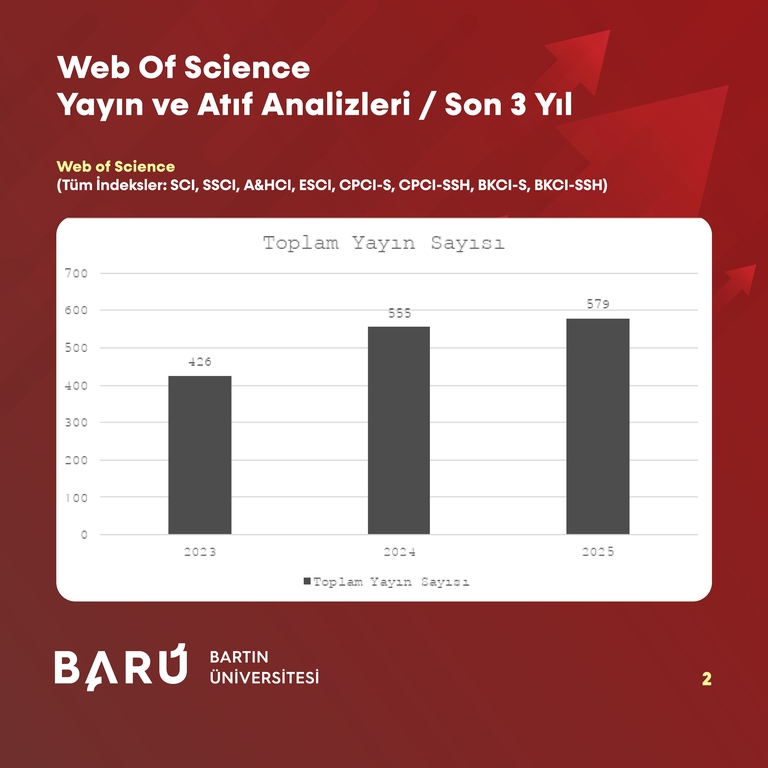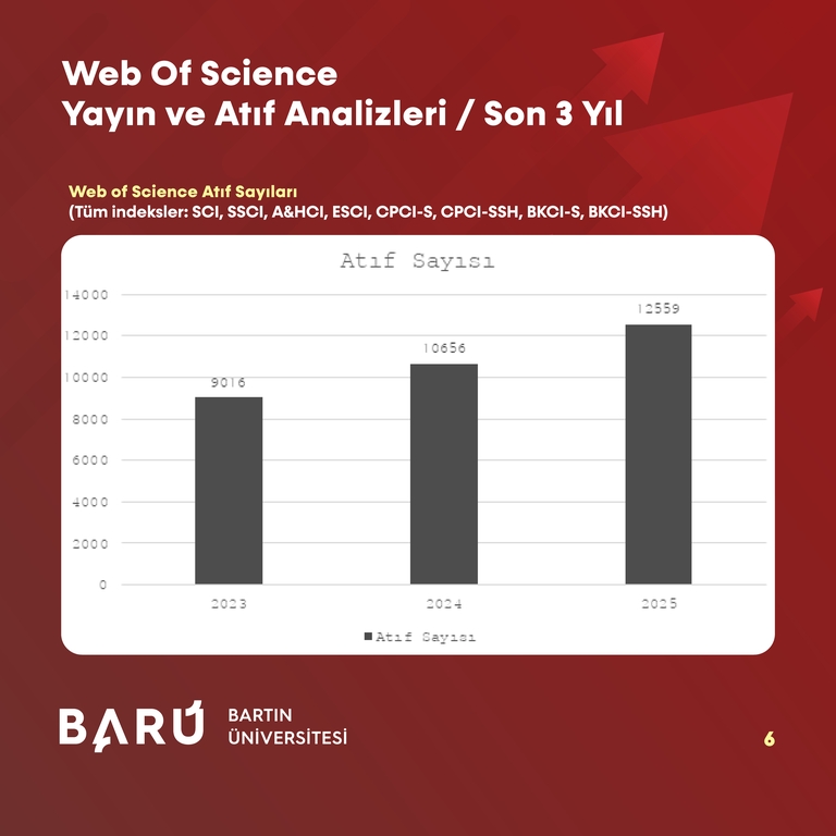 BARÜ’nün, WoS kapsamındaki tüm indekslerde toplam atıf sayısı 2023’te 9.016 iken, 2024’te 10.656’ya ve 2025’te 12.559’a yükselerek 3 yıllık dönemde 3.543 artış kaydetti. WoS çekirdek indeksleri (SCI, SSCI, A&HCI) özelinde ise toplam atıf sayısı 2023’te 8.424, 2024 yılında 9.819 iken 2025’te 11.613’e çıkarak 3.189’luk bir artış gösterdi.