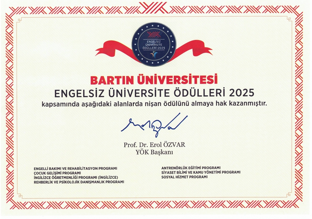 Bartın Üniversitesi (BARÜ) Yükseköğretim Kurulu (YÖK) tarafından düzenlenen törende 7 programıyla en çok “Engelsiz Üniversite Program Nişanı” alan üniversiteler arasında yer aldı.