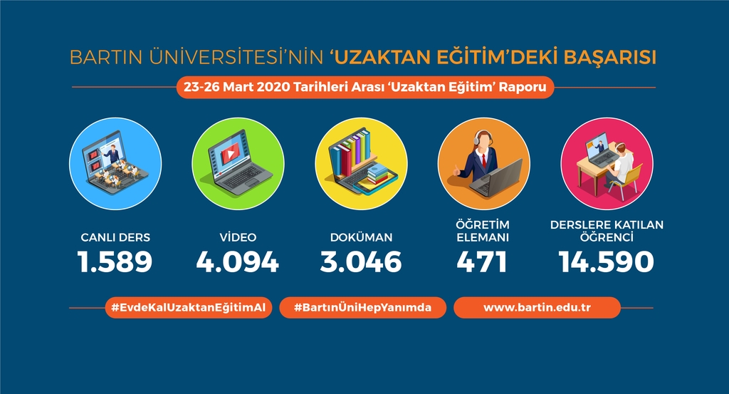 Yeni tip Koronavirüs (Kovid-19) nedeniyle eğitim-öğretimin sekteye uğramaması için tüm hazırlıklarını tamamlayan Üniversitemizde 23 Mart 2020 Pazartesi günü başlayan ‘Uzaktan Eğitim’ dersleri başarıyla sürdürülüyor. Üniversitemiz Rektörü Prof. Dr. Orhan Uzun’un açılış dersiyle geçilen ‘Uzaktan Eğitim’ sistemiyle 23-26 Mart 2020 tarihlerini kapsayan 4 günde bin 589 canlı ders yapıldı, 4 bin 94 video ve 3 bin 46 doküman öğrencilerle paylaşıldı.